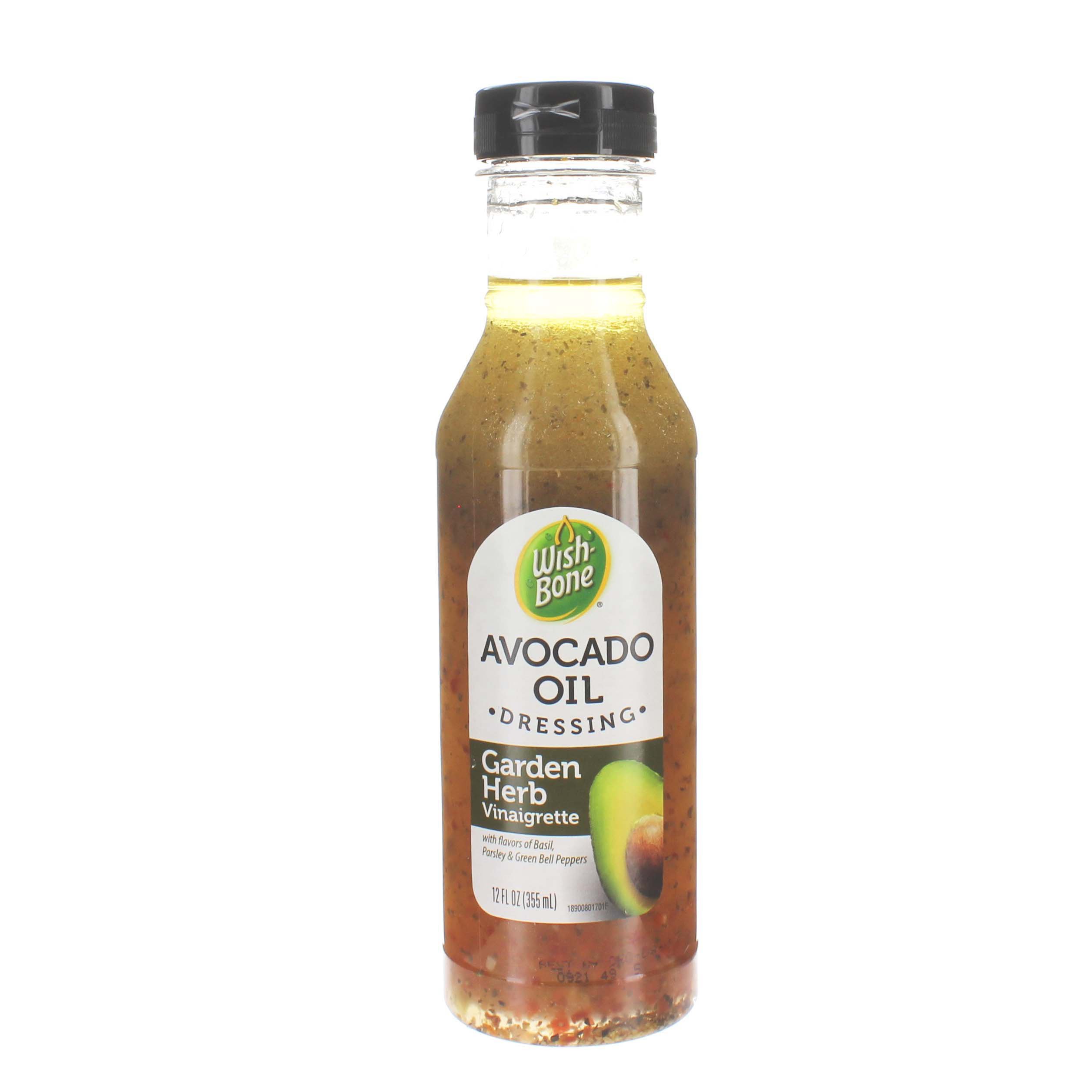 One 15 fl oz bottle of wish bone avocado oil blend garden herb vinaigrette dressing adds delicious herb flavor to your favorite dishes made with avocado oil and flavors of basil parsley and bell peppers vinaigrette salad dressing with no trans fat and made without high fructose corn syrup.